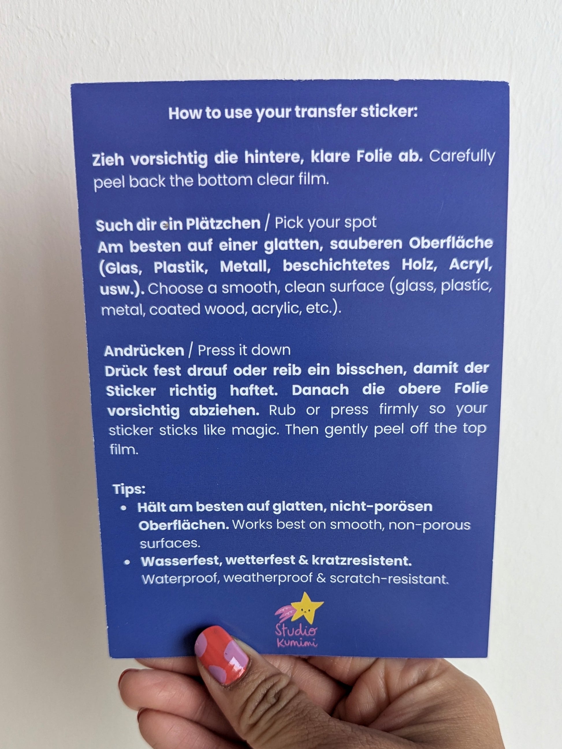 - Instructions – All stickers come with an instruction card in both German and English :)